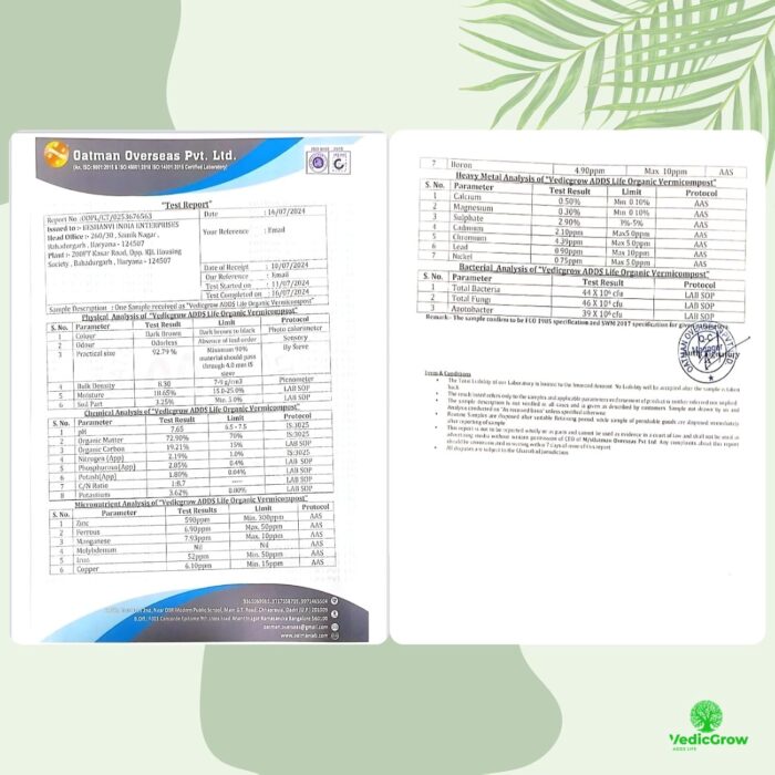• CERTIFIED UNDER FCO 1985 & SWM 2017— Our vermicompost is rigorously tested and certified to meet Indian organic fertilizer standards, making it a trusted, high-quality solution for all types of gardening, from home plants to large-scale organic farms.
